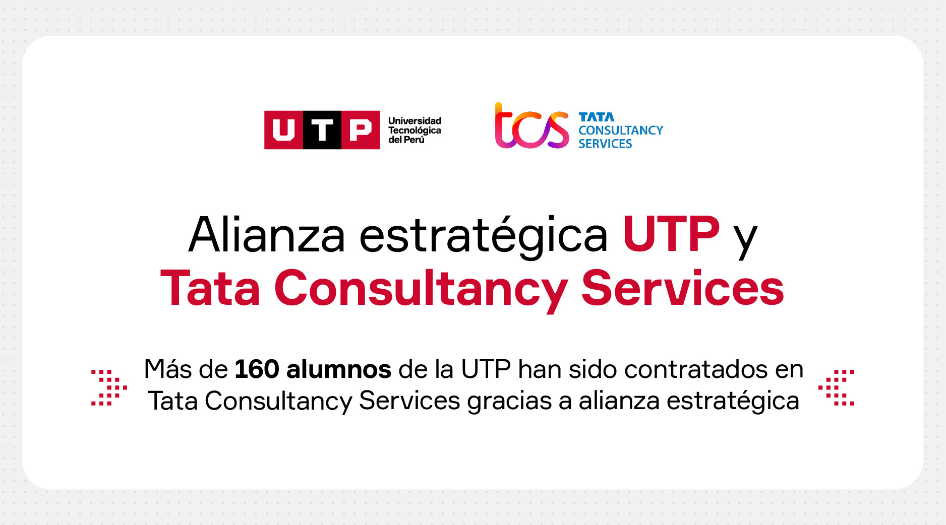 La Universidad Tecnológica del Perú (UTP) y Tata Consultancy Services (TCS), empresa multinacional india de consultoría y servicios de tecnología de la información, mantienen una relación estratégica que permite generar e intercambiar conocimientos en beneficio del crecimiento profesional de los estudiantes. Gracias a esta alianza, en los últimos años, más de 160 alumnos de las carreras de Ingeniería de la UTP han sido contratados para trabajar en TCS Perú.