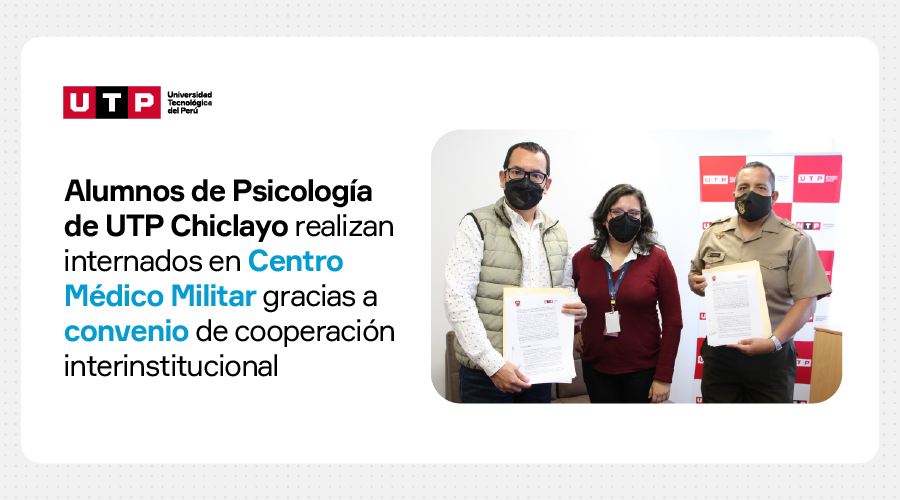 El Campus UTP Chiclayo y el Centro Médico Militar de la Sétima Brigada de Infantería “Divino Niño del Milagro de Eten” firmaron un acuerdo de cooperación interinstitucional que permite el desarrollo de actividades y acciones comunes para contribuir con la mejora de la salud mental de la comunidad, al propiciar espacios de formación y capacitación para los estudiantes del último año de la carrera de Psicología.