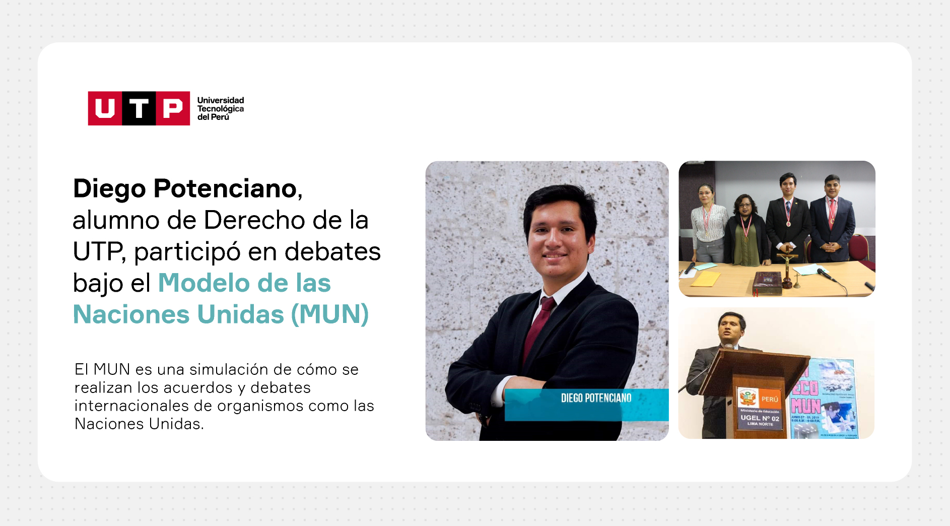 Es estudiante de la carrera de Derecho del Campus UTP Lima Centro y ha participado en varios debates bajo el Modelo de las Naciones Unidas (MUN). Además, ha sido voluntario de AENU Perú, donde fue capacitado para enseñar este modelo en colegios públicos.