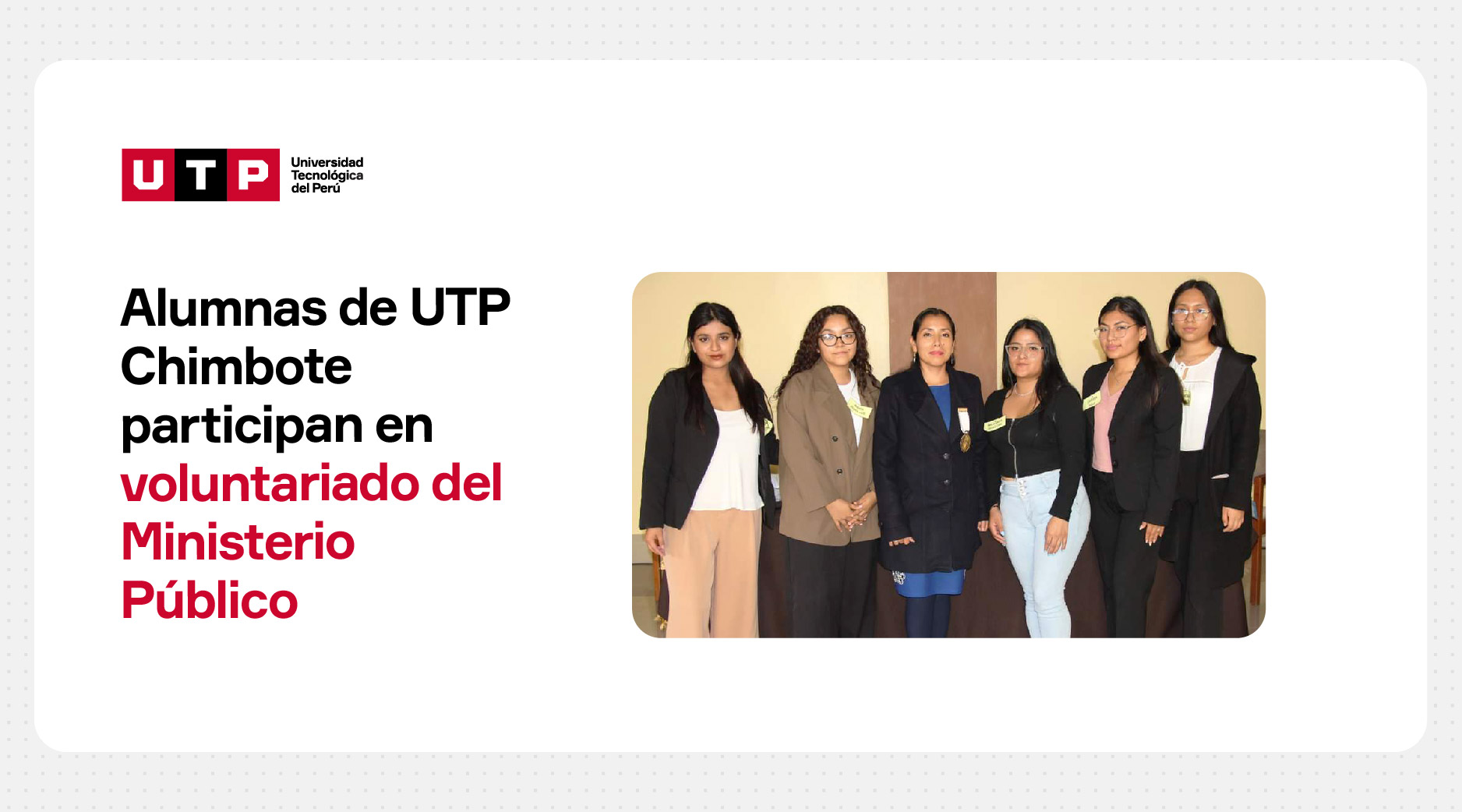 Tres estudiantes de Psicología del Campus UTP Chimbote fueron seleccionadas para formar parte del Programa Nacional de Voluntariado Universitario del Ministerio Público. Ellas realizarán actividades en el Programa Justicia Juvenil Restaurativa hasta enero de 2024.