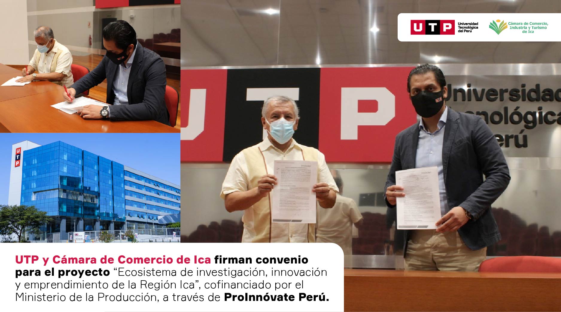 La Universidad Tecnológica del Perú y la Cámara de Comercio de Ica firmaron un convenio para la ejecución del proyecto “Ecosistema de Investigación, Innovación y Emprendimiento de la Región Ica - EIIR ICA”. Este ha sido seleccionado entre las mejores propuestas a nivel nacional en el segundo concurso de Dinamización de Ecosistemas Regionales promovido y cofinanciado por el Ministerio de la Producción, a través de ProInnóvate Perú.