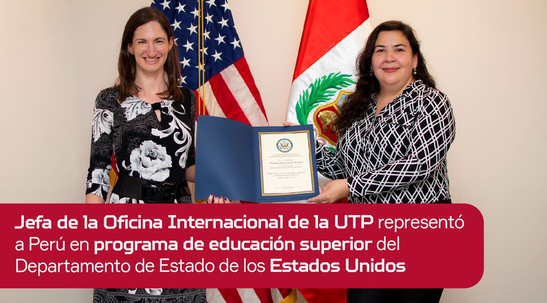 Mariella Cantoni, Jefa de la Oficina Internacional de la UTP, fue seleccionada por la Embajada de EE.UU. en Perú para participar, junto a líderes en educación de Latinoamérica, en el programa “International Visitor Leadership Program (IVLP) - Educación Superior en los Estados Unidos: Innovación y Oportunidades de Asociaciones”. Este tiene como uno de sus objetivos evaluar las oportunidades de vínculos internacionales con universidades y gobiernos extranjeros.