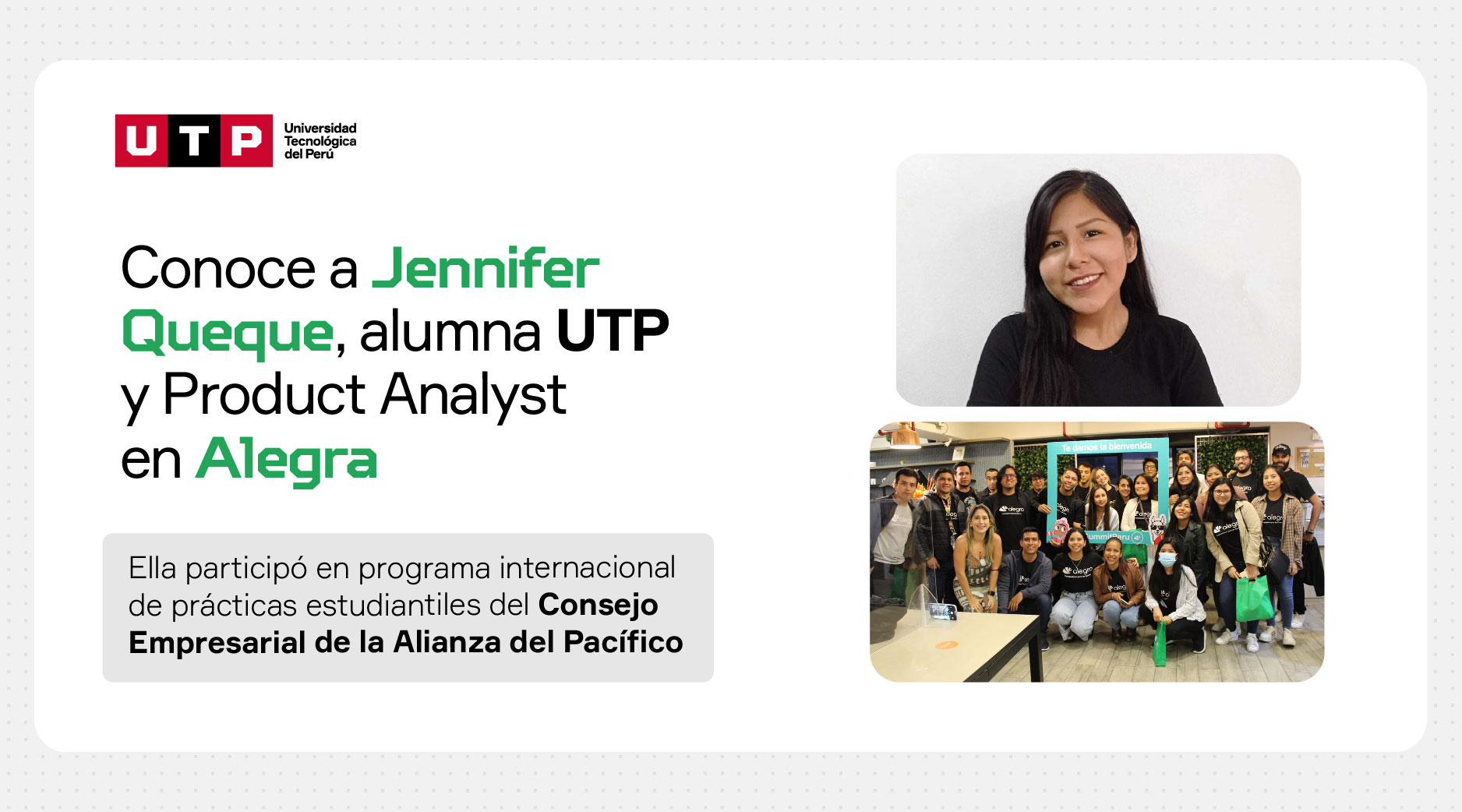 Es estudiante de Ingeniería Empresarial del Campus Lima Centro y trabaja en Alegra, empresa colombiana con presencia en más de 13 países que ofrece un sistema integral, administrativo y de facturación en la nube. Jennifer empezó como Product Intern gracias al programa de Prácticas Estudiantiles del Consejo Empresarial de la Alianza del Pacífico (CEAP), del que forma parte la UTP. Hoy en día, tiene el cargo de Product Analyst.