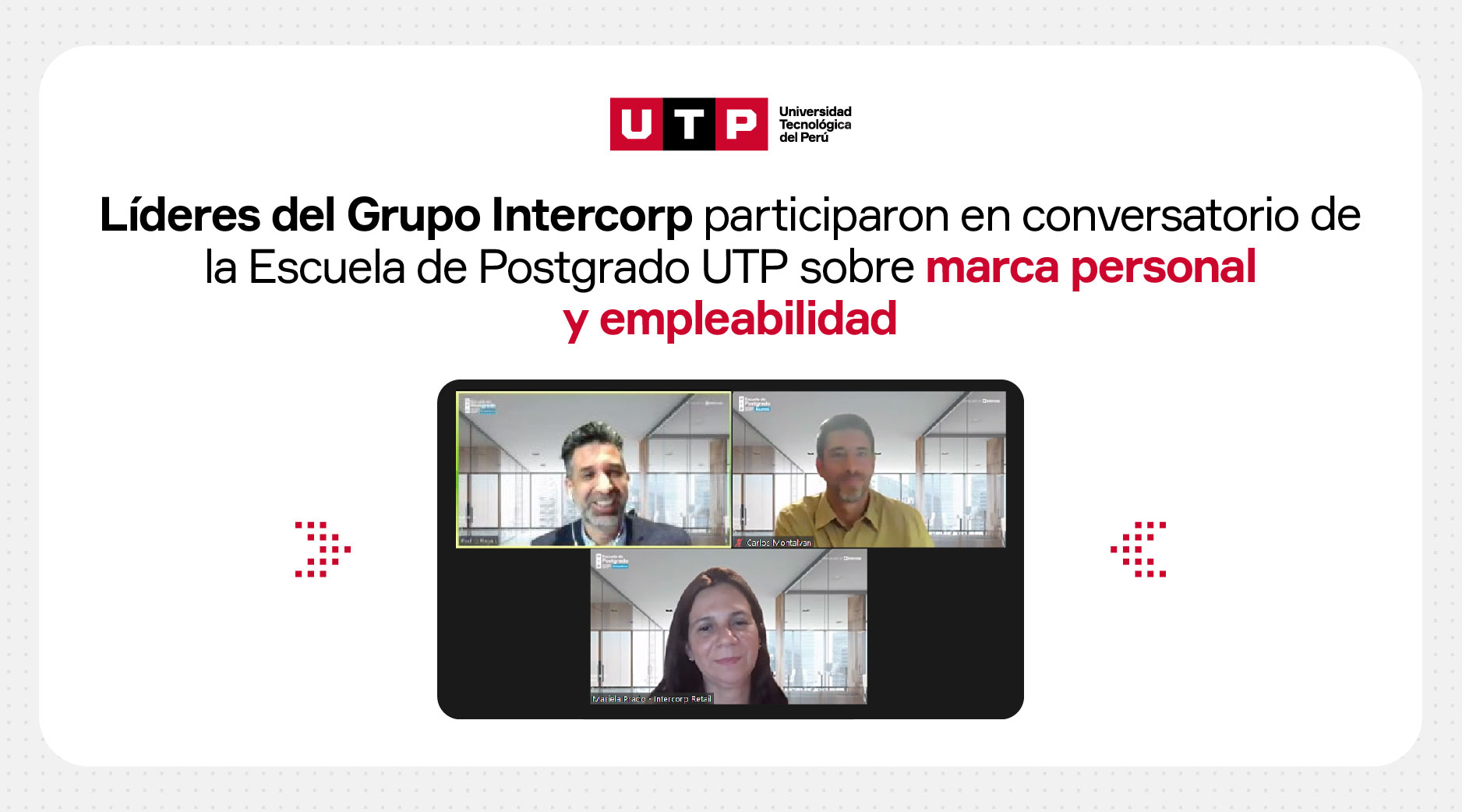 La Escuela de Postgrado de la UTP llevó a cabo el conversatorio “Marca Personal y Empleabilidad”, a cargo de Mariela Prado, Vicepresidenta de GDH y Sostenibilidad en Intercorp Retail, y Carlos Montalván, Vicepresidente de Talento en Intercorp. Este evento fue desarrollado en el marco del Primer Encuentro Virtual de Egresados organizado por la EPG UTP.
