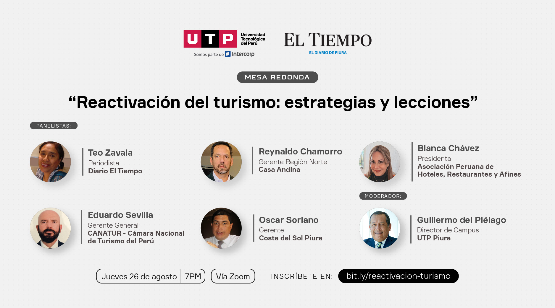 El Campus Piura de la Universidad Tecnológica del Perú (UTP) y el diario El Tiempo de esta ciudad realizaron la Mesa Redonda “Reactivación del turismo: estrategias y lecciones”, con la participación de un panel de especialistas en el sector.