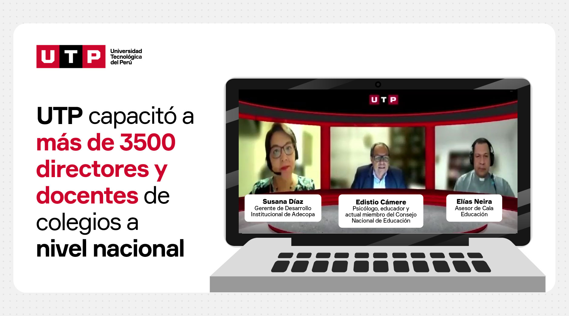 La Universidad Tecnológica del Perú (UTP) realizó el IX Encuentro Nacional de Directores, evento virtual que contó con la participación de más de 3500 docentes y directores de secundaria de más de 20 ciudades del país.