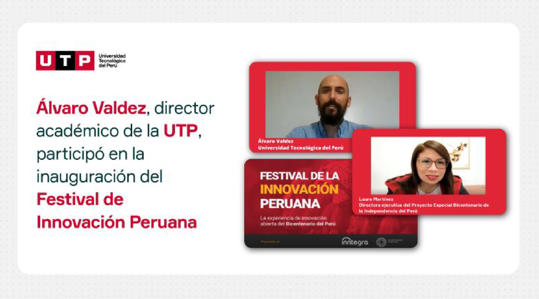 La Universidad Tecnológica del Perú, como Embajadora del Bicentario, estuvo presente, con la representación de Álvaro Valdez, director académico general de la Universidad Tecnológica del Perú (UTP), en la inauguración del Festival de Innovación Peruana (FIP2021), presentado por Inntegra y el Proyecto Especial Bicentenario del Perú.