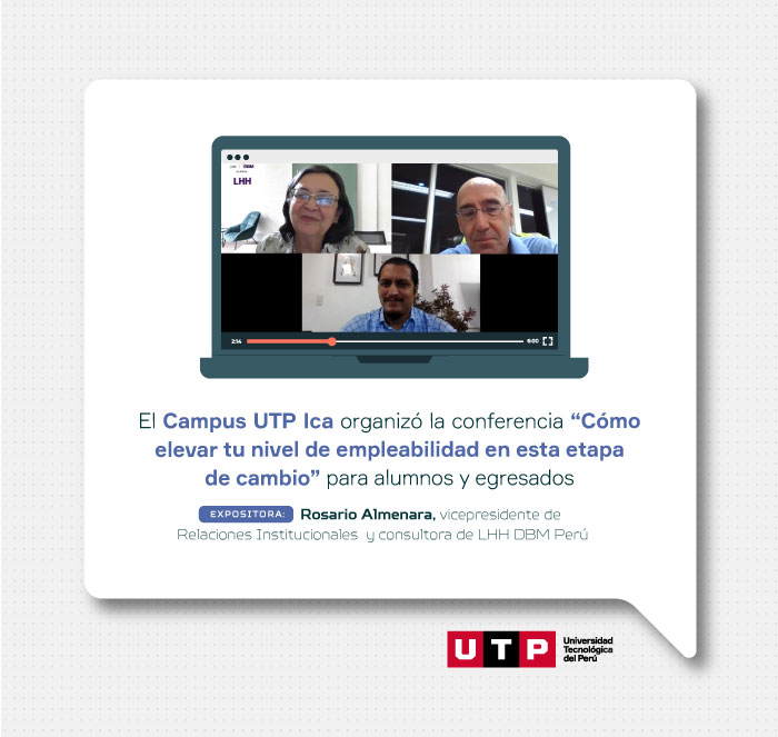 Con el objetivo de potenciar las habilidades profesionales de alumnos y egresados, el campus UTP Ica realizó la conferencia “Cómo elevar tu nivel de empleabilidad en esta etapa de cambio”.
